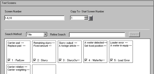 Specifies the number of the text screens to copy. Select the check box associated with each screen preview to add the screen ID to this field.