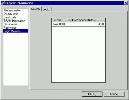 You can check the screen number's current memory usage, or the logic program's current logic capacity, symbol variable capacity, address points, and comment memory. You can change the proportion of the logic capacity and comment memory depending on the use.