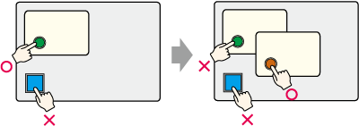 Touch operations are possible only on the topmost window. When a window set up with the [Disable touch outside windows] option is displayed, and another window is opened with the [Disable touch outside windows] option disabled, touch is enabled only on the newly opened window.