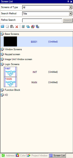 Select the screens to list from [All], [Base Screen], [Window Screen], [Keypad Screen], [Screen Unit Window Screen], [Logic Screen], [Function Block], or [I/O Screen].