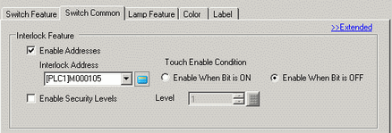 If you want the color and label to change when it is Interlocked, select the [Show Interlocked Condition] check box in the [Switch Common] tab's [Extended] view. Then, in the [color] and [Label] tabs, from the [Select State] field you can select [Interlocked] and define the interlocked state's colors and label.