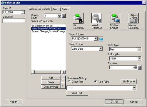 Use text from a previously saved Text Table. If you want to add or select item names to the text table, select [Add Text] from the text input pull down menu, type the text, and click [OK] to register/select new item names to the text table.