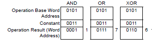 Performs a boolean logic operation (AND/OR/XOR) between the Word Address value and the specified constant value. The result is written to the [Word Address].