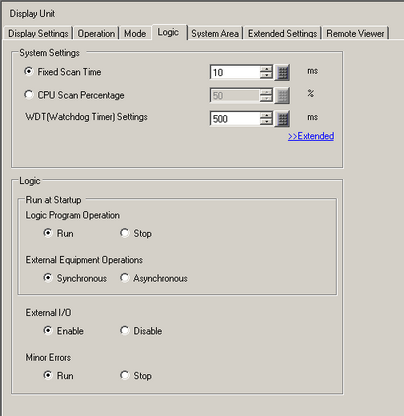You can configure the time of each logic scan. The settings range from 10 to 2000 ms.
