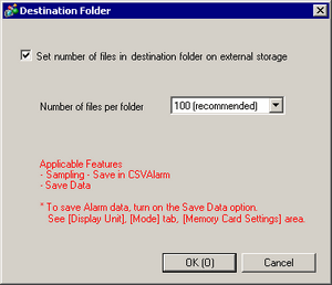 The setting applies to both alarm history and sampling data. You cannot set up the file/folder partitioning for only one of these features or set up different file numbers.