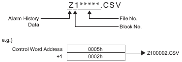 For example, when [File Number] = 2 and you send the command to save alarm history data for Block1, data is output to external storage's "ALARM" folder with the file name "Z100002.CSV".