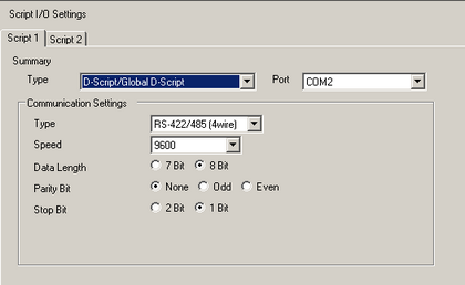 Select [D-Script/Global D-Script] to use the "SIO Port Operation" function, which communicates using a serial port for D-script or Global D-script. Select [Extended Script] to use extended scripts.