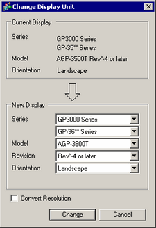 Even if the size of the display screen area changes on changing the display unit model, parts drawn on the screen appear in the same size and location as before the model change. To adjust the part size and the position relative to the resolution of the display unit model, select the [Convert Resolution] check box.