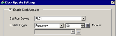 Select the [Enable Clock Updates] check box, and from the [Get From Device] list select the device/PLC for updating the clock.