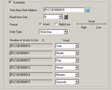 In the [Time Area Start Address] field define the first address with the clock data. In the [Read Area Size] field define the number of words that store the clock data. For example, [Read Area Size] = 6, [Format] = [Word]