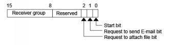 Set the receiver group and turn ON bit 1 (request to send e-mail bit). Tun ON bit 0 (start bit) to send e-mail.