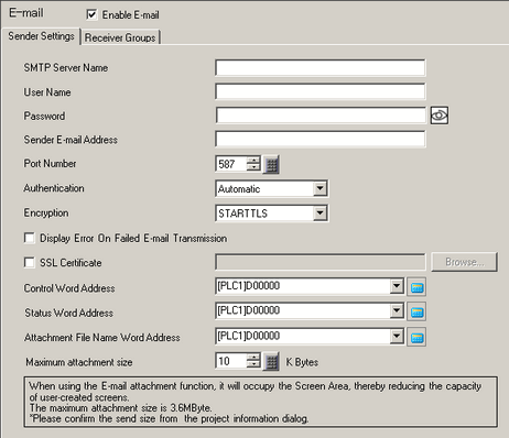 When a root certificate is required, select the [SSL Certificate] check box and select a root certificate (*.pem) suitable for the mail server. The selected file is transfered to the display unit on transferring the project.