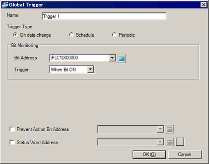 Use a bit address so trigger conditions are not satisfied. While the Prevent Action Bit Address is ON, even if the trigger condition is satisfied, functions set up with the trigger will not run. Only while this value is OFF will trigger conditions become satisfied.