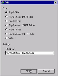 The [Add] dialog box appears. Select the [Play CF File] option, in the [File Name] field type the file name of the movie (for example, MC060527_152346.SDX) to add to the playlist, and then click [OK]. (If the file resides in the "MC" folder, type "MC\MC060527_152346.SDX".)