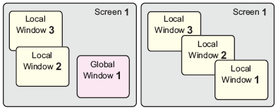 For example, when global windows are set up, the number of local windows you can display simultaneously on a screen decreases by 1.