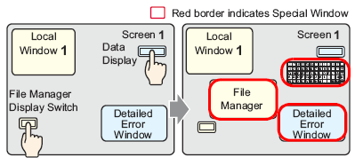 A Special Window has a higher priority display function than a Global or Local Window. Therefore if a File Manager (displayed as a Local Window) overlaps a Detailed Error Window while the Detailed Error Window is displayed, the File Manager will be hidden under the Detailed Error Window.