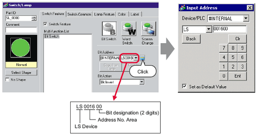Set the [Bit Address]. From [Device/PLC], select [#INTERNAL] and designate LS0016 bit 0.