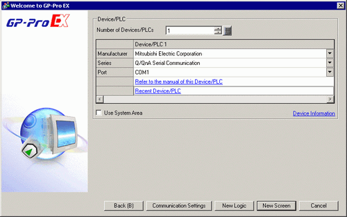 Click [Communication Settings] to set up the communication format and other settings. The setup procedure is the same as 3.2 Creating a Project - Start / Create Screen / Save / Exit, steps 6 to 7.