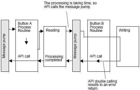WinGP SDK prohibits calling another device access API during a call to one device access API (Double calling). However, the device access API is operating the message pump in the API, so if an event happens, the user program starts.