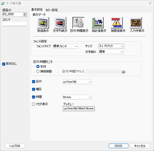 [フォント設定]で表示する日付/時間のフォントを設定します。(例 : 標準フォント、サイズ8x16ドット、文字飾り 標準)