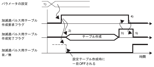 加減速パルス用テーブル作成要求と完了フラグのタイミングチャートを下図に示します。