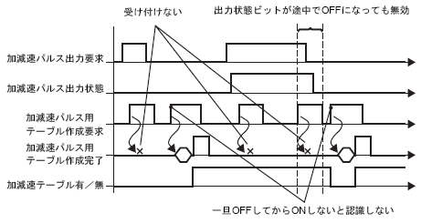加減速パルス出力中(「加減速パルス出力要求」のビットがONしている)は、下図のように加減速パルス用テーブル作成要求を受け付けません。