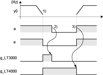 1) パルス出力(y0)の出力回数が設定パルス数に到達するとパルス出力が終了し、パルス出力状態(e)がOFFになります。それと同時に、設定パルス数出力完了(g)がONになります。