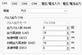 出力パルスが初期出力周波数から定常出力周波数まで変化する時間を設定します。加減速時間は、0ms~65535msまで設定可能です。STC6000シリーズでは[加減速時間]、LT4000シリーズでは[加速時間]と[減速時間]に設定します。