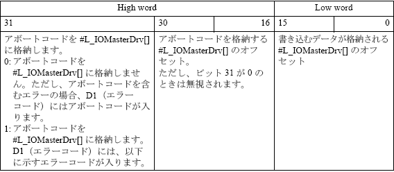上位16ビットは、最上位ビットをONにしシステム変数 #L_IOMasterDrv[0]~[255]の配列の要素番号を指定すると、アボートコードが指定した変数に書き込まれます。