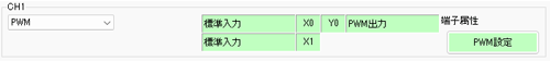 [プロジェクト]メニューの[システム設定]-[I/Oドライバ設定]をクリックし、[内部ドライバ1]画面で[PWM設定]をクリックします。