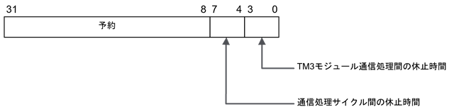 TM3モジュールの通信処理間の休止時間を、1ms単位で0〜15の範囲で設定します。例外として値が0の場合も休止時間が1msとして扱われます。初期値は0です。