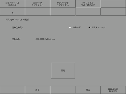 PDFファイルリストが保存されているストレージを[SDカード]または[USBストレージ]から選択します。