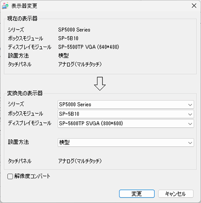 表示器の機種を変更することで表示画面エリアのサイズが変わっても、画面上に配置されている部品は機種変更前と同じ位置に、同じサイズのままで表示されます。機種の解像度に合わせて部品サイズや位置を自動調整したい場合は[解像度コンバート]にチェックを入れます。