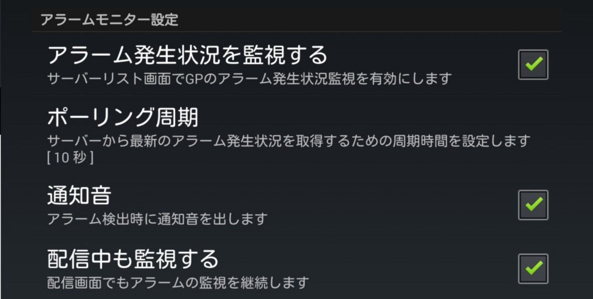 「サーバーリスト画面」でGPのアラーム発生状況監視を有効にします。