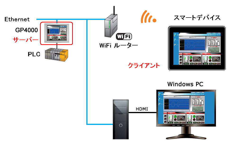 サーバーとはPro-face Remote HMI機能を使用するうえで、クライアントに対して画像データを配信する表示器(HMI)を指します。