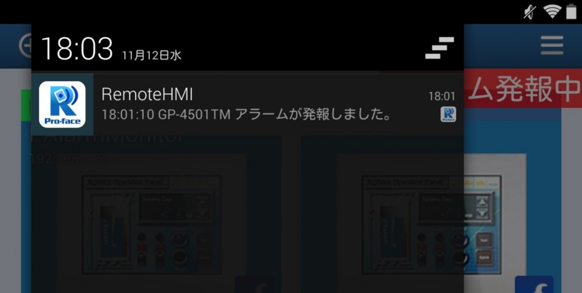 Android版に限り、クライアントがアラームの発生を検知したときに、ステータスバー上にメッセージを表示します。