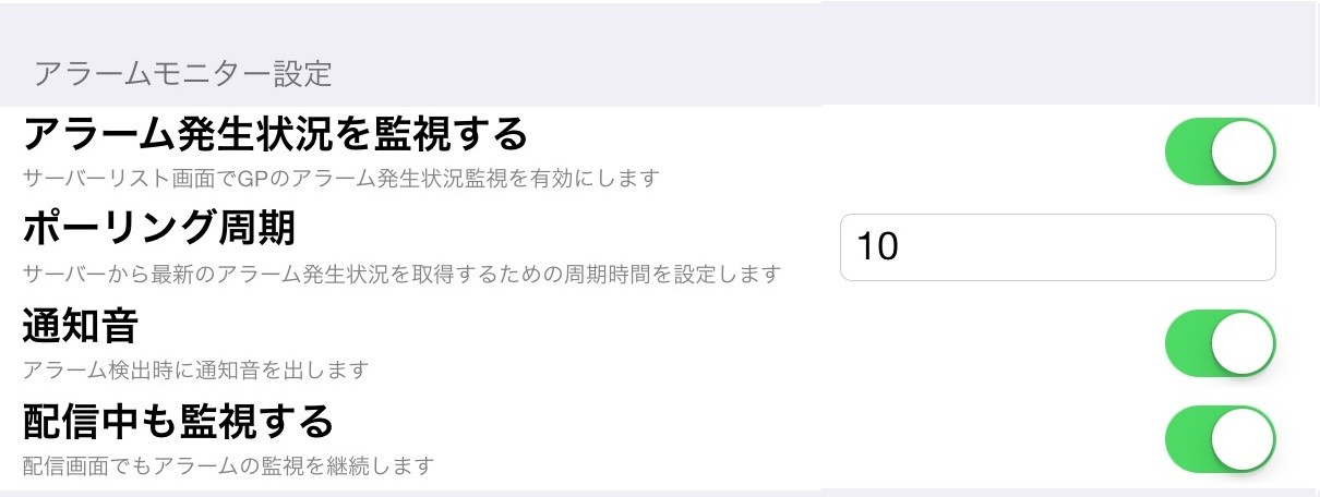 - 従来、「サーバーリスト画面」上でしか動作しなかったアラームモニタ機能が配信画面上でも動作するようになりました。