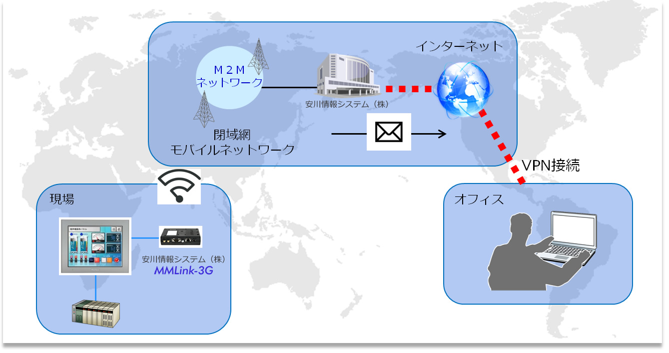 MMLink-3Gを用いて遠隔地からの表示器の画面の確認が可能です。以下の接続例・接続方法を参照してください。