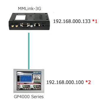 MMLink-3GのIPアドレス(192.168.000.133 *1)を、GP4000の「デフォルトゲートウェイ」に設定してください。