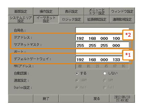 *1 このIPアドレスをGP4000のオフラインのデフォルトゲートウェイに設定してください。