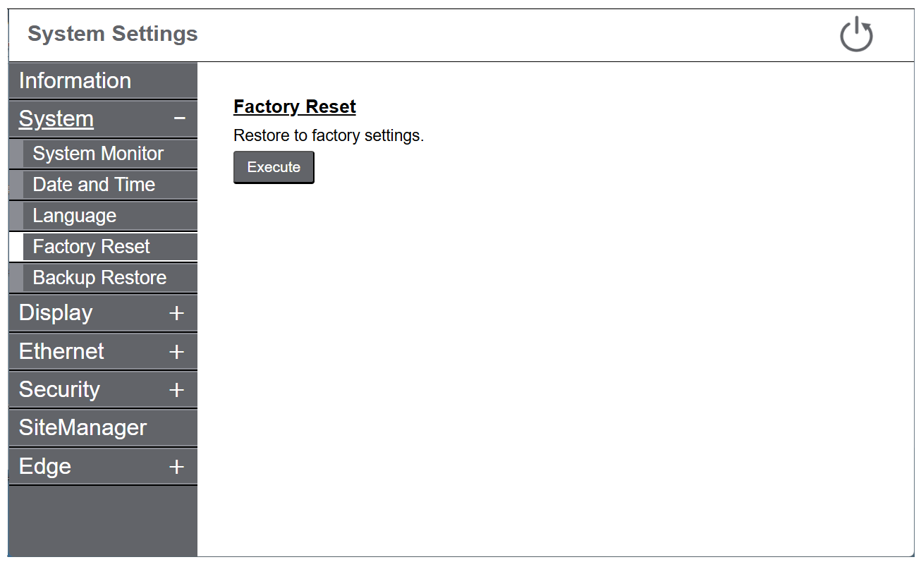 - 触摸 Execute 按钮。执行出厂复位并且产品重新启动。
