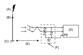 It is expected that there will be an effect on this product due to fluctuations in grounding potential when there is a large surge flow of electrical energy to the lightning rod ground at the time of a lightning strike. Provide adequate distance between the lightning rod grounding point and the surge protection device grounding point.