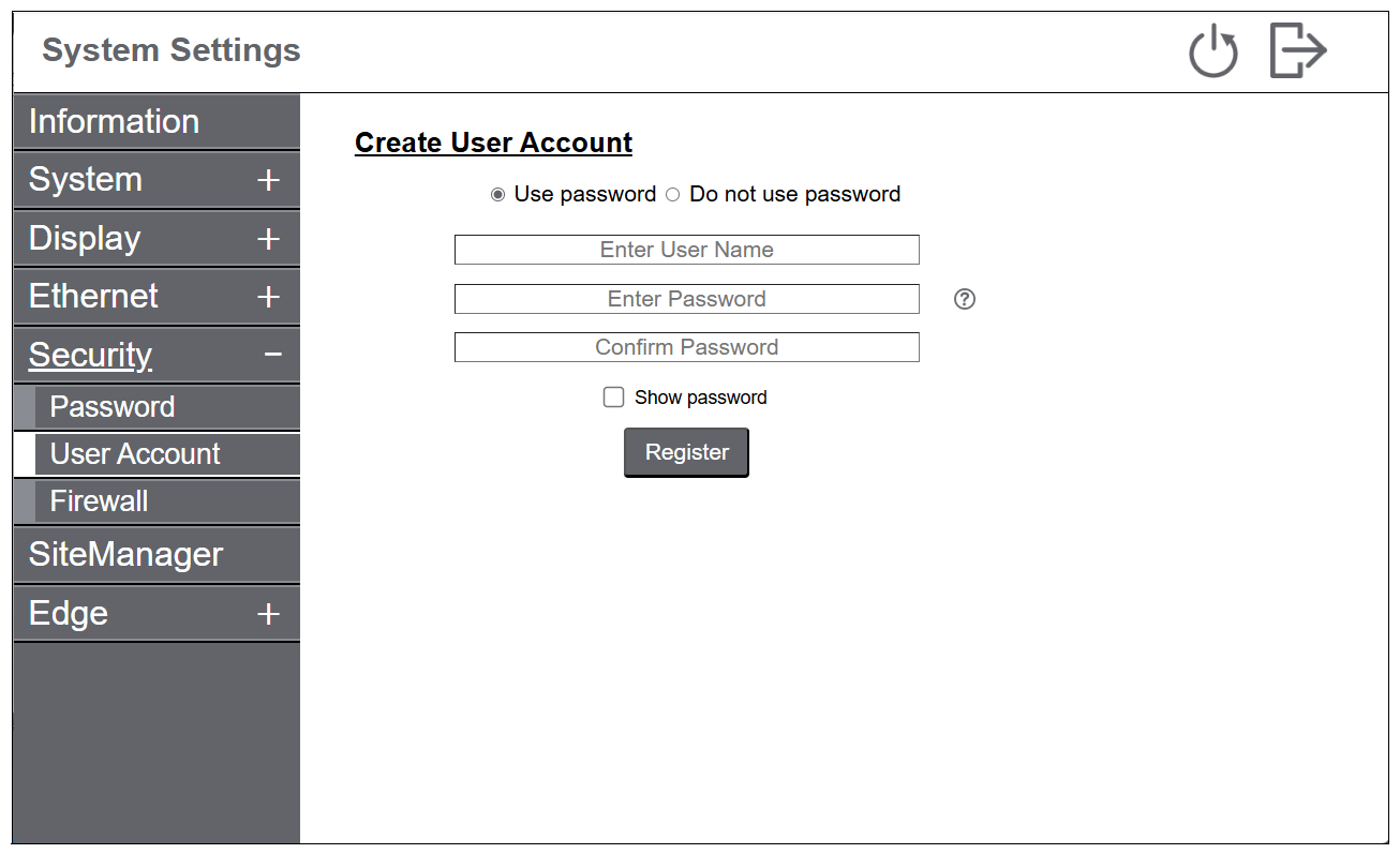 - メニューから Security > User Account を選択します。