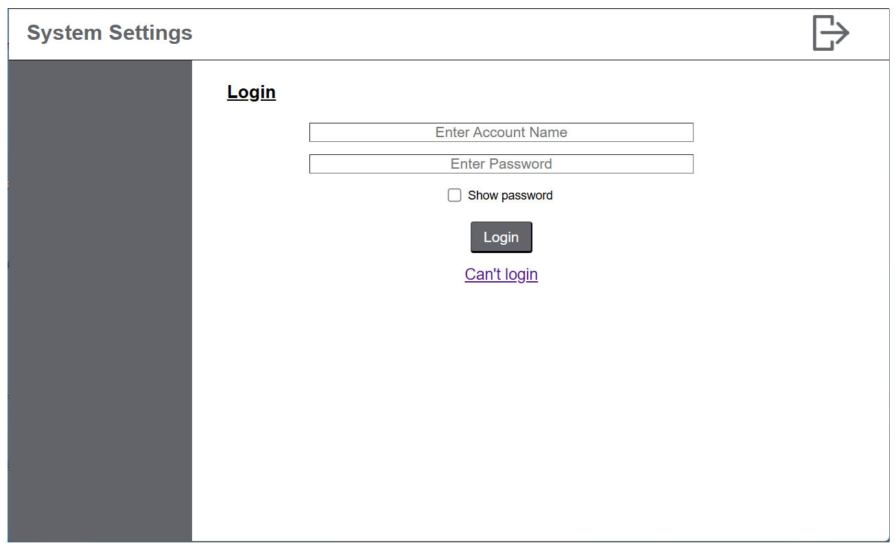 - 必要に応じてその他の設定を変更します。システム設定機能の詳細については、システム設定メニュー を参照してください。注記: 管理者アカウントの作成時に Use password を選択した場合、他のユーザーアカウントを追加することもできます 。詳細については、ユーザーアカウントの追加 / 削除 を参照してください。通常の運用時には標準ユーザーアカウントを使用し、システム開発やメンテナンス時のみ管理者アカウントを使用するなど、状況に応じて適切なアカウントを使用してください。