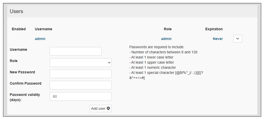Vous pouvez modifier les exigences en matière de mot de passe. Pour plus d'informations, reportez-vous à la section Password Policy.