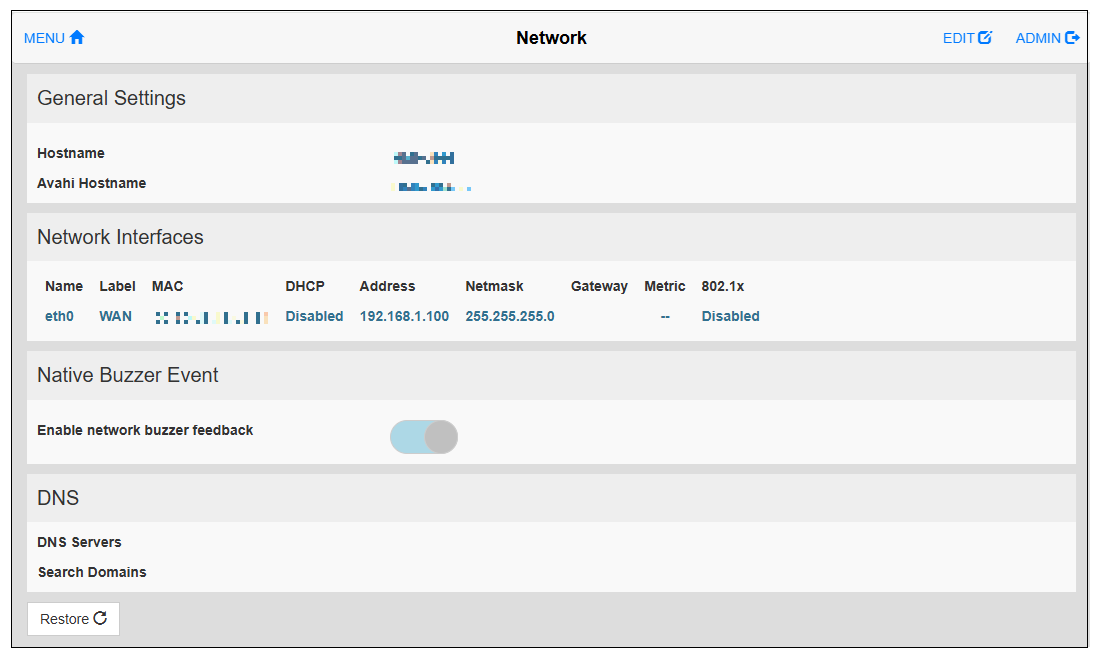 - Wählen Sie im Menü die Option Network. Wählen Sie Network Interface und berühren Sie dann EDIT. Legen Sie die IP-Adresse des Geräts, die Subnetzmaske usw. fest. Tippen Sie auf SAVE, um die Änderungen zu speichern.