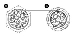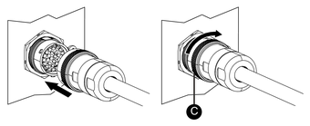 - Collegare il cavo. Controllare le forme dei connettori per fissarli con l'orientamento corretto. Ruotare l'anello di bloccaggio nella direzione della freccia per fissare il cavo.
