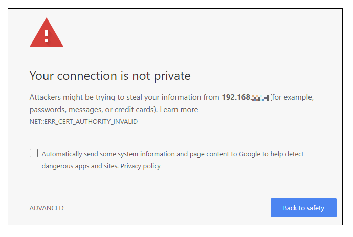 - Quando viene stabilita la connessione, il dispositivo HMI invia il certificato da utilizzare per la crittografia. Poiché il certificato non è firmato da un'autorità di certificazione, verrà visualizzato un messaggio di avviso. Fare clic sulle opzioni ADVANCED e scegliere di procedere.