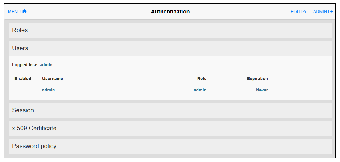 - メニューから Authentication を選択します。画面右上の EDIT をタッチし、編集モードに切り替えます。