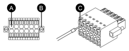 - 各コネクターのピンアサインを確認して、各ワイヤーを挿入口にしっかり挿入します。ピンアサインについては、有線アダプターのインターフェイス仕様 を参照してください。注記: 電線を取り除くには、開放ボタンを指またはドライバーで押さえてワイヤーを引き抜きます。